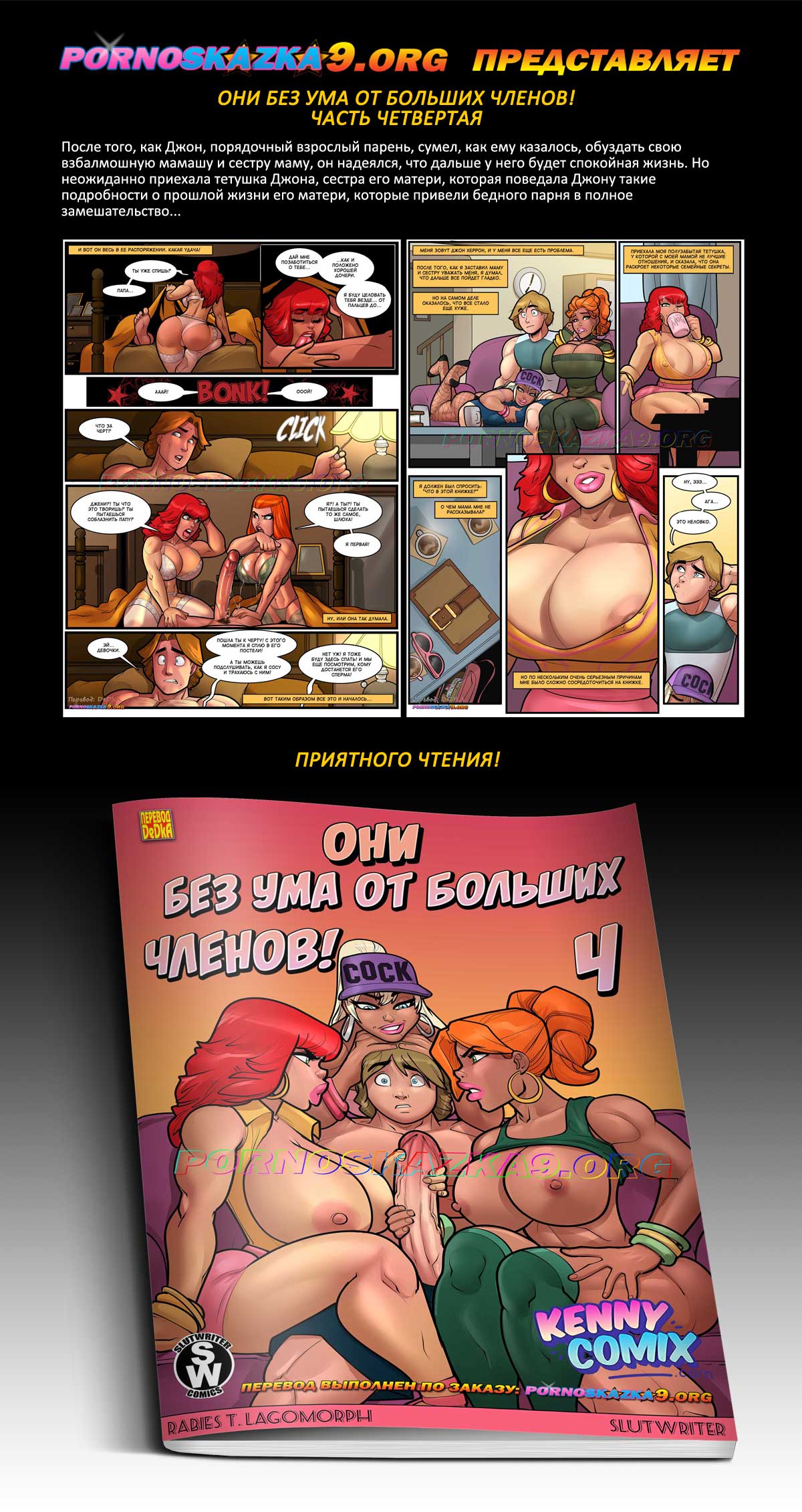 Порно комикс Они без ума от больших членов! Часть 4. После того, как Джон, порядочный взрослый парень, сумел, как ему казалось, обуздать свою взбалмошную мамашу и сестру маму, он надеялся, что дальше у него будет спокойная жизнь. Но неожиданно приехала тетушка Джона, сестра его матери, которая поведала Джону такие подробности о прошлой жизни его матери, которые привели бедного парня в полное замешательство…